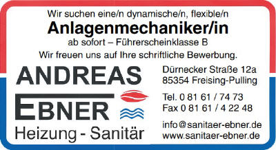 Wir suchen ab sofort einen Anlagenmechaniker mit Führreschein Klasse B.Für Vorab-Informationen können Sie uns unter Tel: 08161-7473E-Mail: info@sanitaer-ebner.de